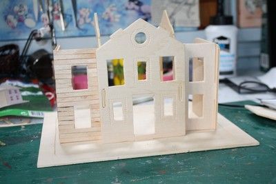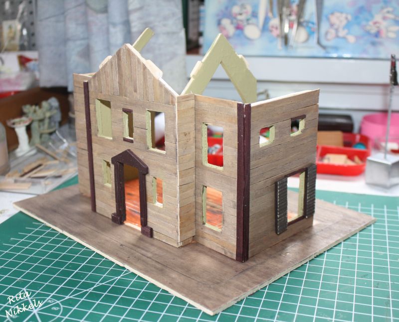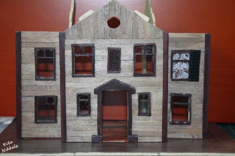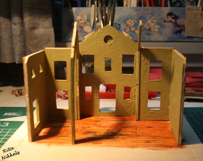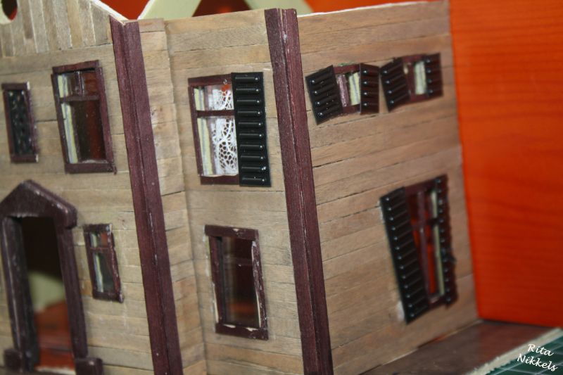 De ramen wijzig ik een klein beetje naar eigen inzicht en dan beplak ik de buitenkant met koffieroerhoutjes, zodat de bestaande perforatie's niet meer te zien zijn.