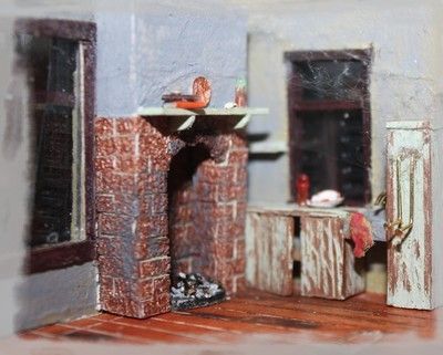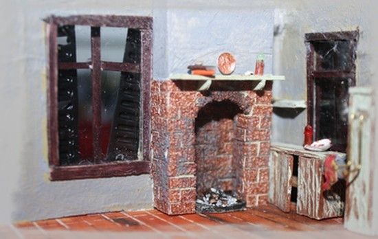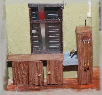 De luiken snij ik uit plastic vleesschaaltjes. Het moet er allemaal oud en verzakt uit komen te zien, dus plak ik sommigen er schuin op.