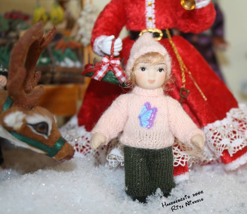 Doortje heeft een donkergroen gebreide broek gekregen, met daarop een mohair trui met een vlinder applicatie en een bijpassende lekkere warme muts.