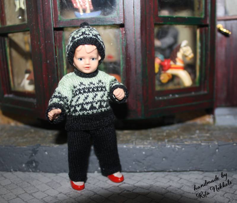 Guusje heeft een zwarte gebreide broek gekregen, met daarop een ingebreide zwart met lichtgroene trui en een bijpassende lekkere warme muts.