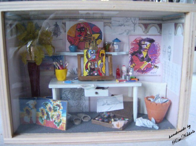 Voor de verjaardag van mijn dochter's schoonmoeder, die als hobby: tekenen en schilderen heeft, heb ik in een klein Ikea kijkbakje, een schildersateliertje gemaakt.