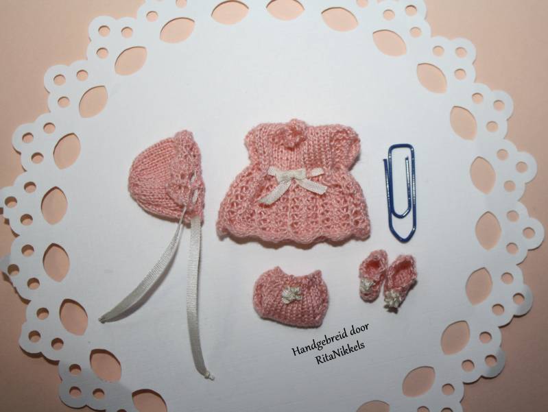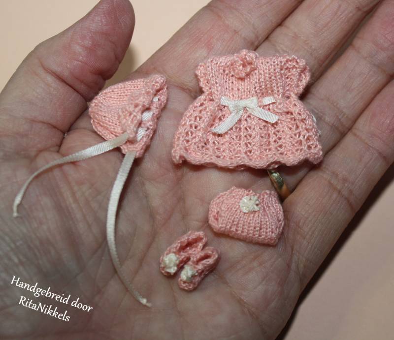 Schattig handgebreid perzikkleurig babysetje bestaande uit een jurkje, mutsje broekje en sokjes
