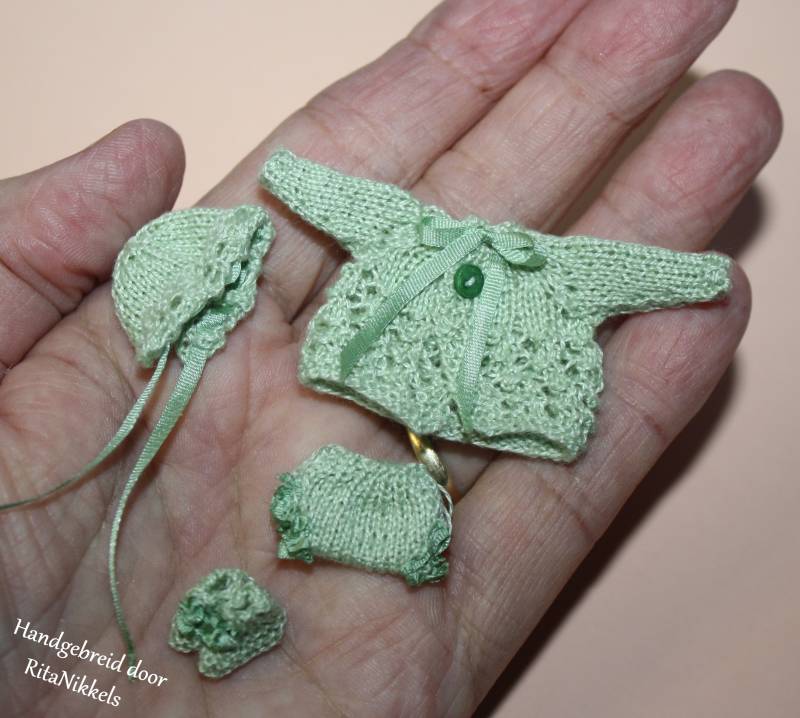 Schattig handgebreid zachtgroen babysetje bestaande uit een jasje, mutsje, broekje en sokjes