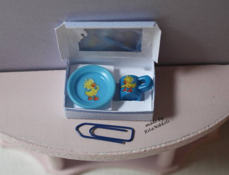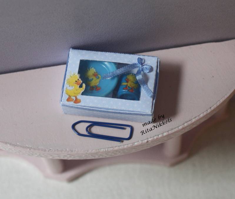 Blauw bordje met bekertje gedecoreerd met een eendje in een schattig bijpassend blauw/wit geruit doosje, afgewerkt met een zijden lintje rondom en een zijden strikje in de hoek