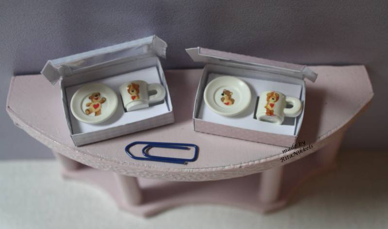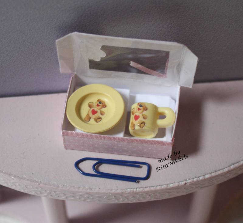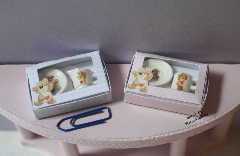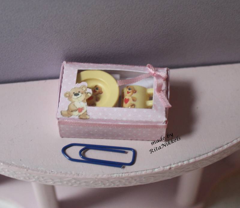 Wit bordje met bekertje gedecoreerd met een beertje in een schattig bijpassend roze doosje met witte stipjes of een blauw/wit geruit doosje