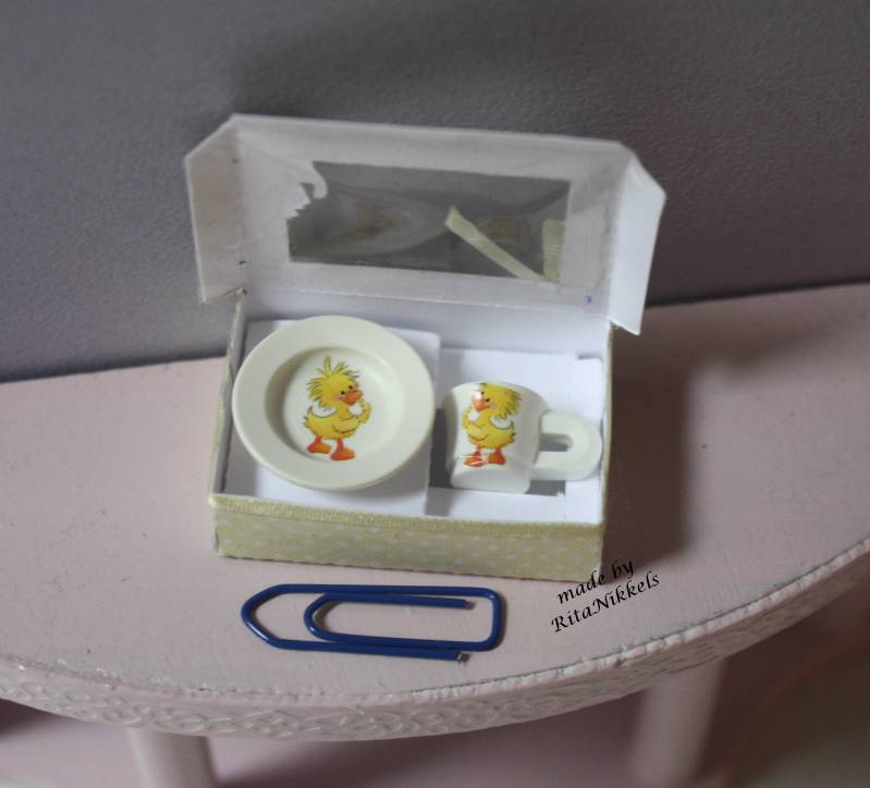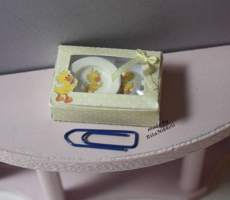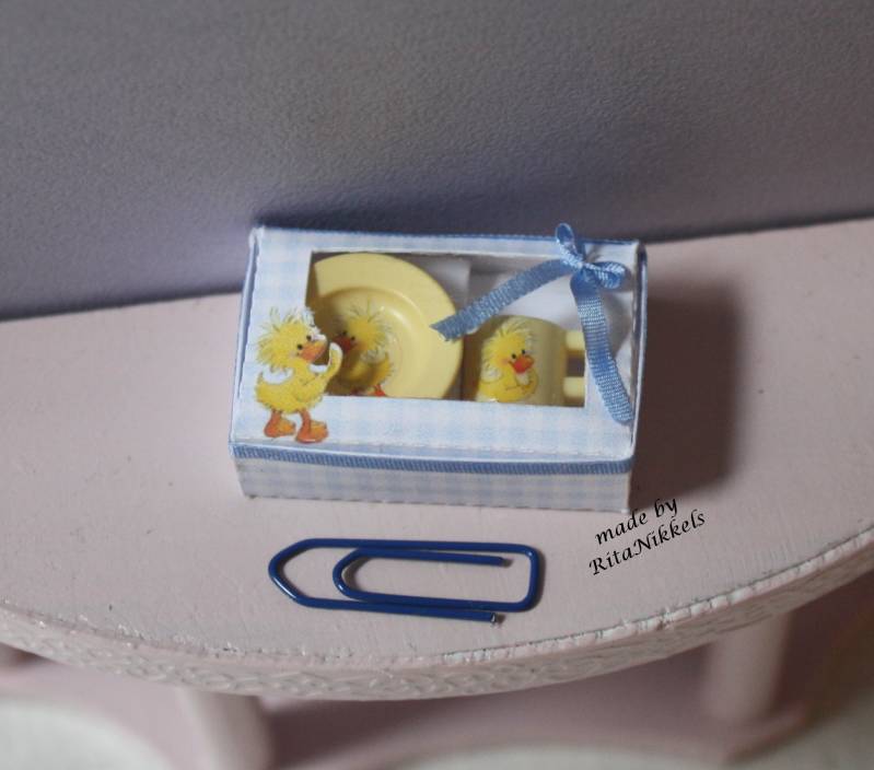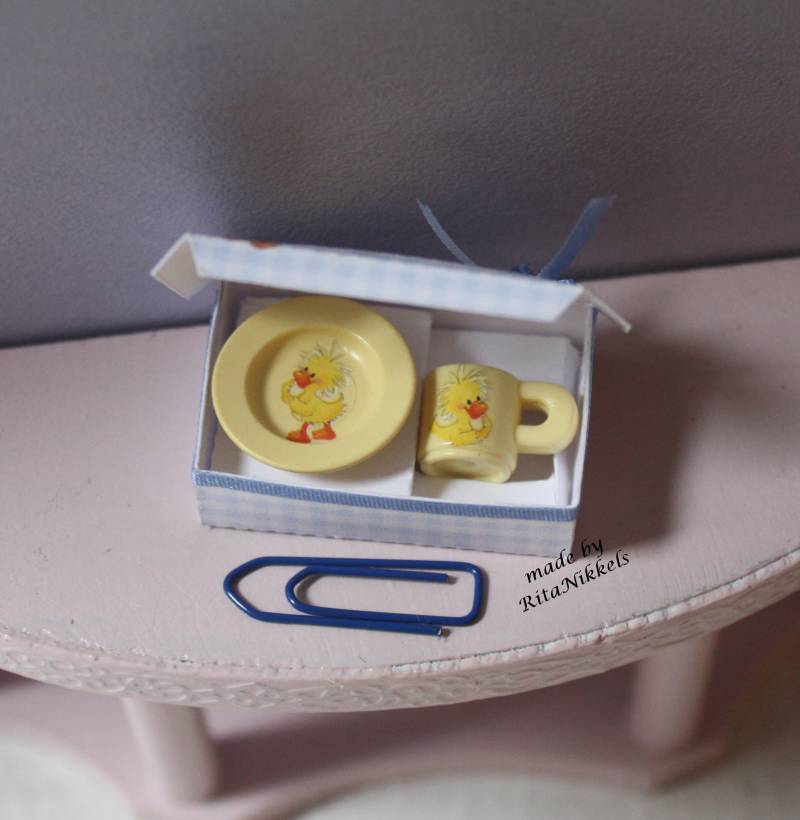 Geel bordje met bekertje gedecoreerd met een eendje in een schattig bijpassend blauw/wit geruit doosje, afgewerkt met een zijden lintje rondom en een zijden strikje in de hoek