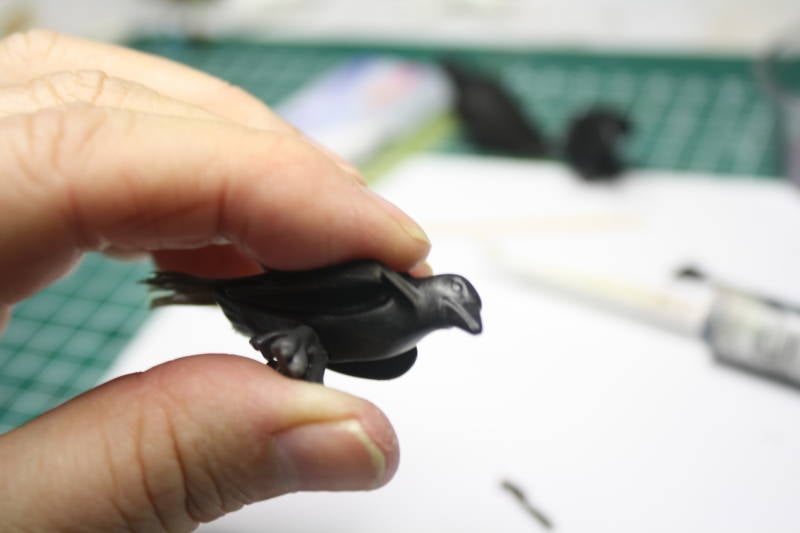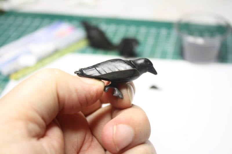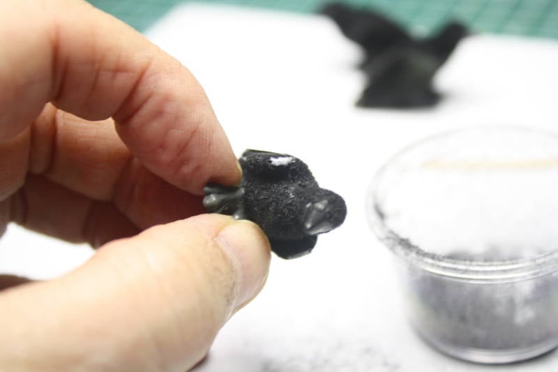 Smeer nu wat lijm op de gehele onderkant van de kraai (vergeet de binnenkant van de vleugels niet) en bedek dat met flock.