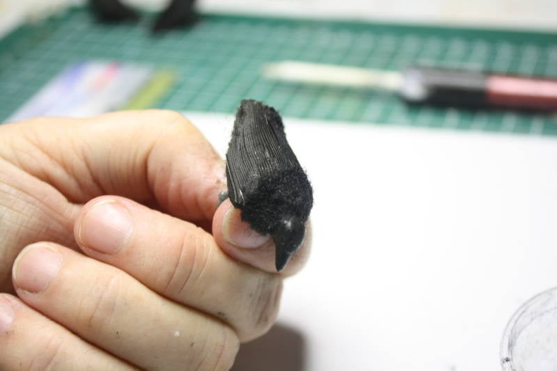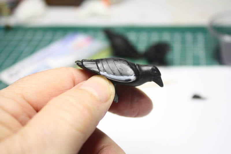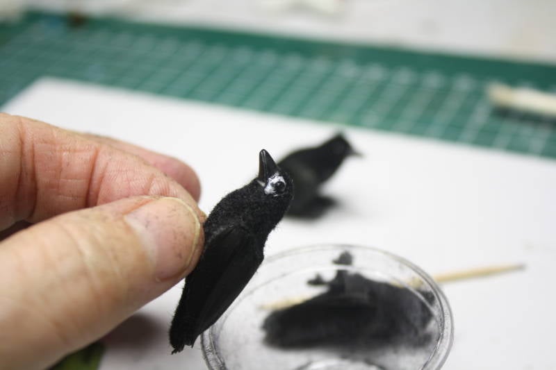 Smeer nu met behulp van een tandenstoker wat lijm op de boven rondingen van de vleugels en lijm met het kwastje de ‘kraag’ in. (niet te dik!) Probeer de kraai steeds zo vast te pakken, bv aan zijn pootjes, dat er geen lijm aan je vingers komt, want dat geeft vlekken op de vacht. Pak met je pincet wat flock en leg het op de lijm, je mag het er best dik opleggen, want het overtollige wordt er toch weer afgeborsteld.
