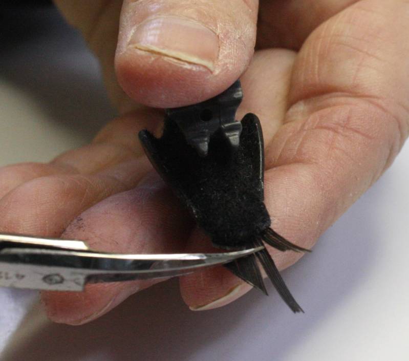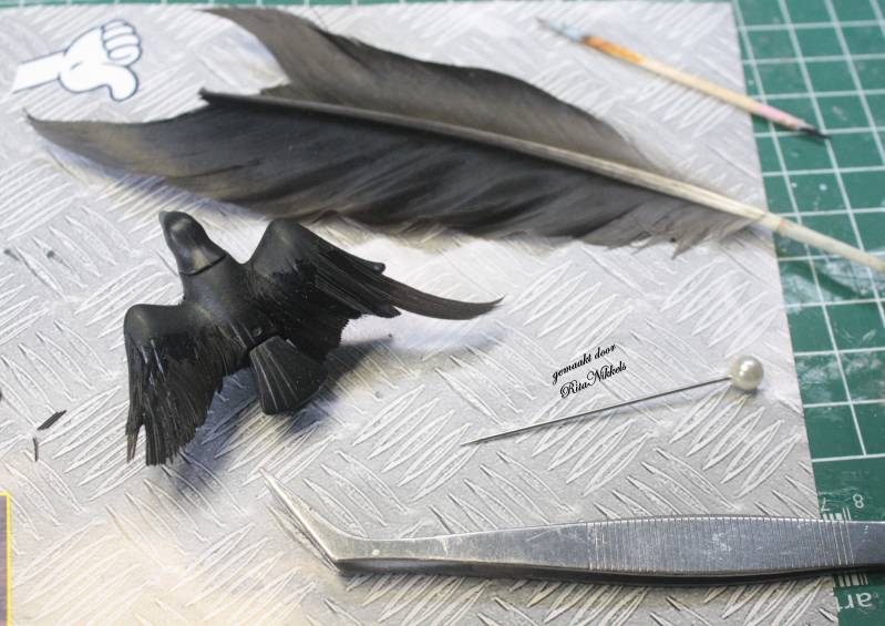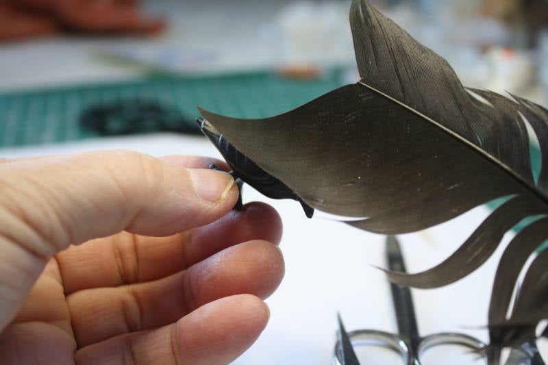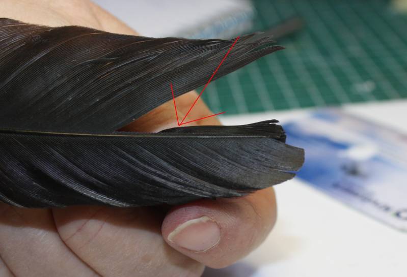 Pak de veer weer op, kijk weer goed wat de binnen-en buitenkant is en leg hem langs een vleugel van de kraai om te kijken welk deel van de veer je het best kan gebruiken. Hou de slagpin als het midden vd rug aan en kijk goed dat de veren in een natuurlijk boog naar achteren lopen.