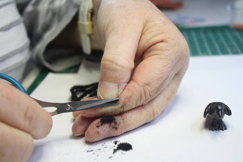 Als alles goed droog is, veeg je heel voorzichtig met het zachte kwastje de overtollige flock weg zodat er een mooi dun vachtje achter blijft.
