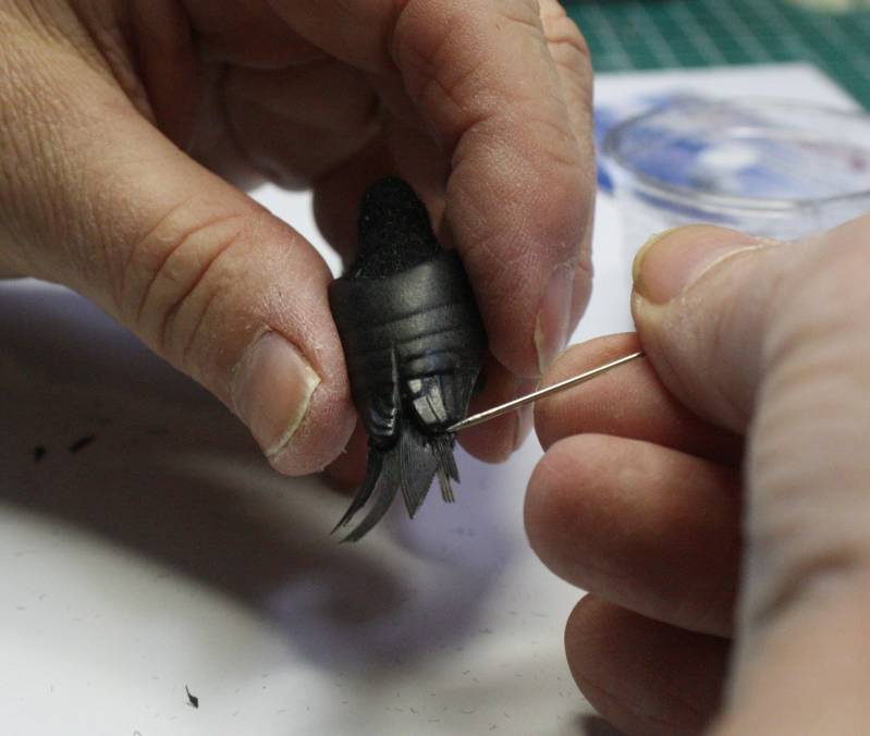Voor je de andere helft gaat plakken, kan je de veer beter eerst in model knippen. Volg daarvoor met het nagelschaartje de ronding . Maak je niet druk als je iets te ver geknipt hebt, want dat kan je later weer met wat flockpoeder bijwerken.