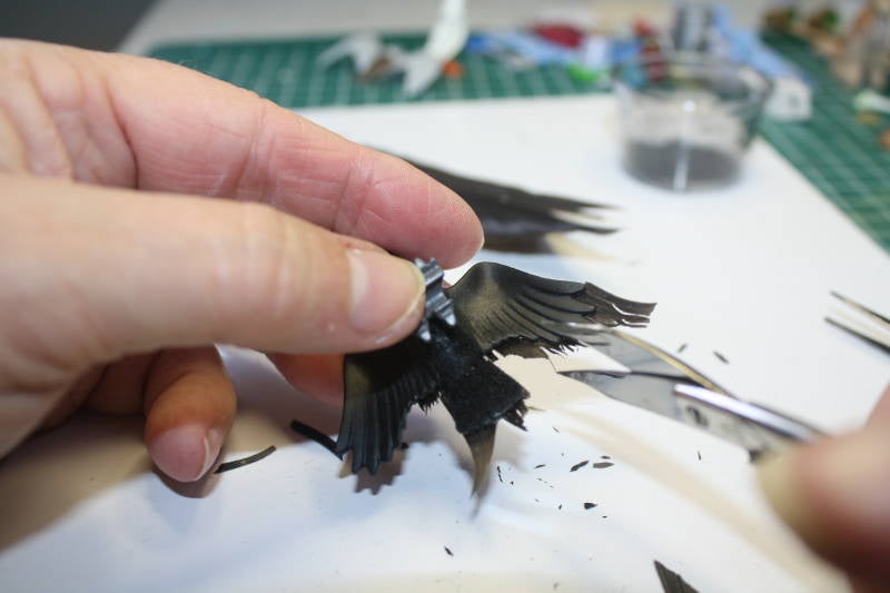 Als het geheel goed droog is, draai je de kraai om en knip je met het nagelschaartje de te lange veren in de vorm van de staart af. Knip het niet té recht, want het moet wel natuurlijk ogen. (klik op de foto's voor een vergroting)